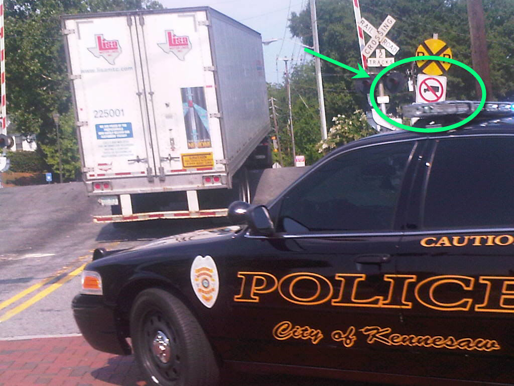I got stuck in a traffic jam while passing through the famous and lovely town of Kennesaw, GA yesterday because of this unattentive truck driver trying to cross a raised railroad crossing: