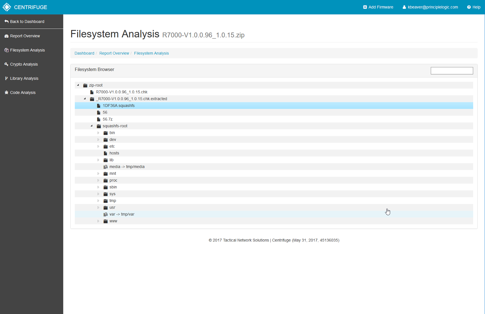Centrifuge is a cloud-based platform that can reverse engineer binary firmware files and analyze them for security flaws. It supports various IoT systems, including firmware from common routers and network devices from Belkin, D-Link, and Linksys, and finds some interesting stuff. For example, here’s the platform showing the file structure from an older Netgear R7000 wireless router’s firmware: